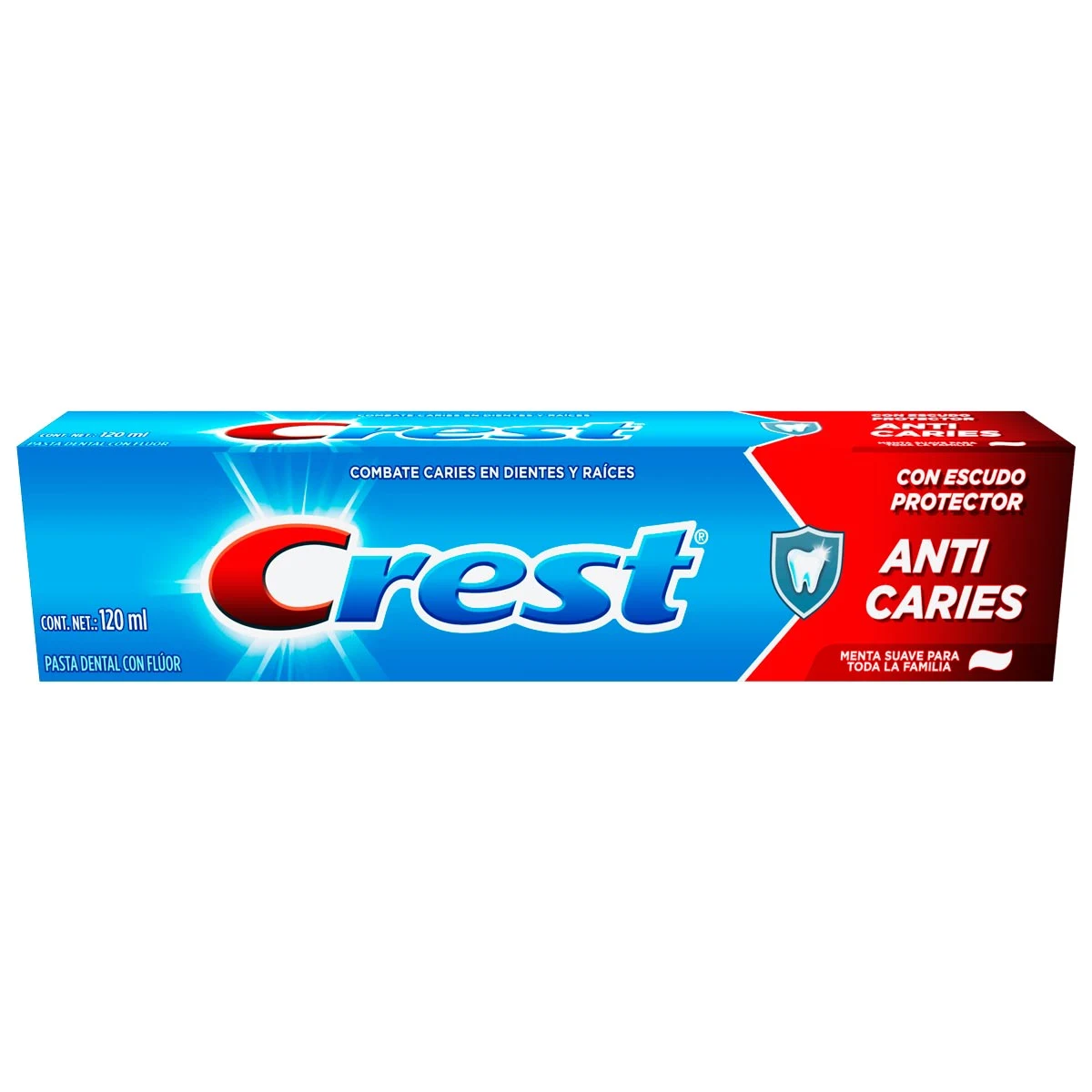 Cresta anti caries, con escudo protector anti caries sabor menta suave y flúor que evita que puedan desarrollarse en dientes y raíces logrando así dientes sanos.